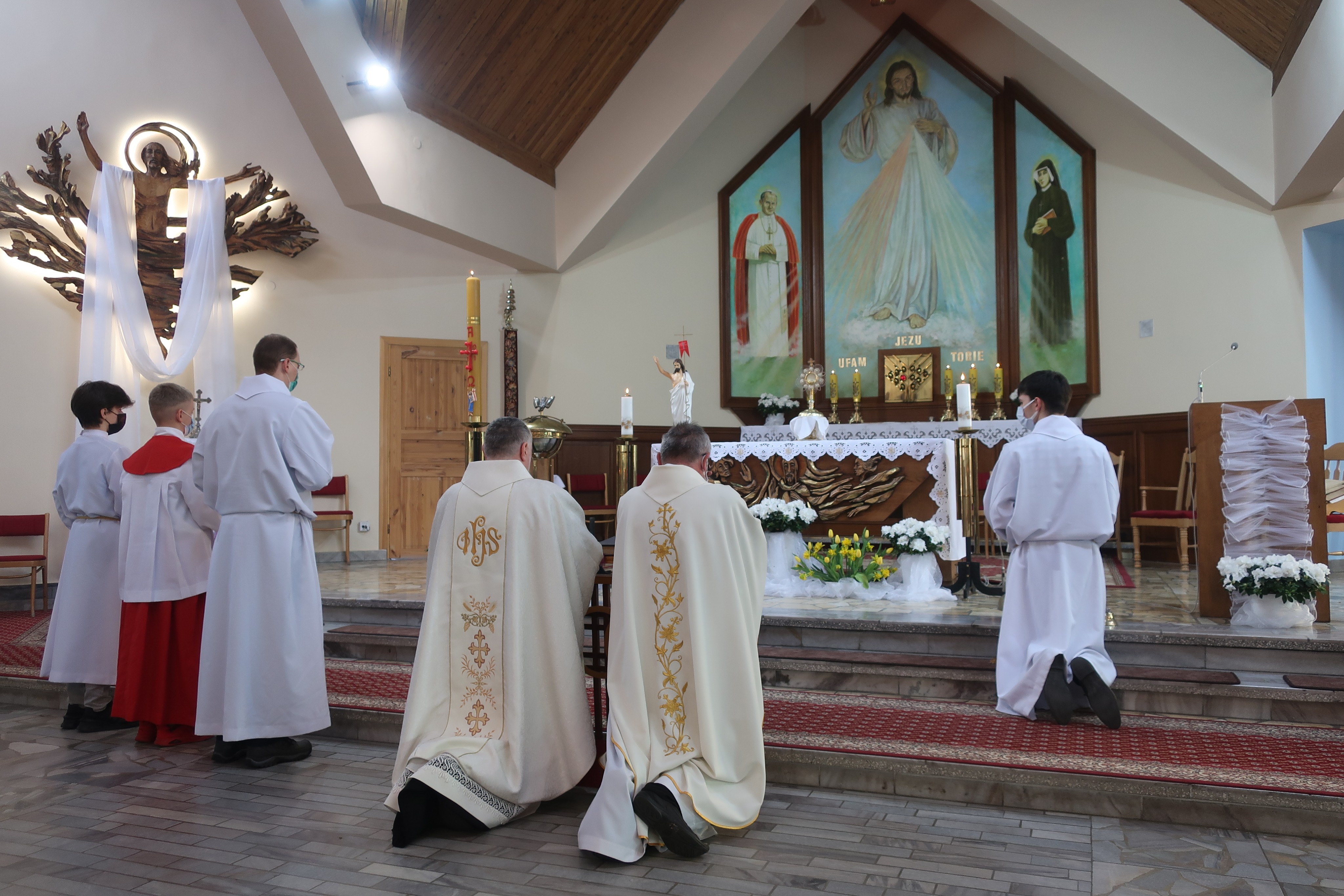 11 kwietnia 2021 roku celebrowaliśmy Niedzielę Miłosierdzia Bożego, wieńczącą okres Oktawy Wielkanocnej. Tym razem suma odpustowa ku czci Miłosierdzia Bożego rozpoczęła się o 9.30. Tradycyjnie poprzedziła ją koronka do Miłosierdzia Bożego wraz z modlitwą za zmarłych, którą poprowadził ks. proboszcz Stanisław Furczoń. Eucharystię koncelebrowali ks. proboszcz Stanisław Furczoń oraz ks. Grzegorz Kurzaj SCJ. Nasz czcigodny gość ze Zgromadzenia Księży Najświętszego Serca Jezusowego wygłosił kazanie na tę okoliczność. Msze świętą swym występem uświetnił młodzieżowy zespół parafialny Aternum. Niestety, pandemiczna rzeczywistość sprawiła, że tradycyjny pochód doookoła świątyni był wykluczony; musiano go zastąpić procesją w środku świątyni. Uroczystość została zwieńczona odśpiewaniem uroczystego "Te Deum".