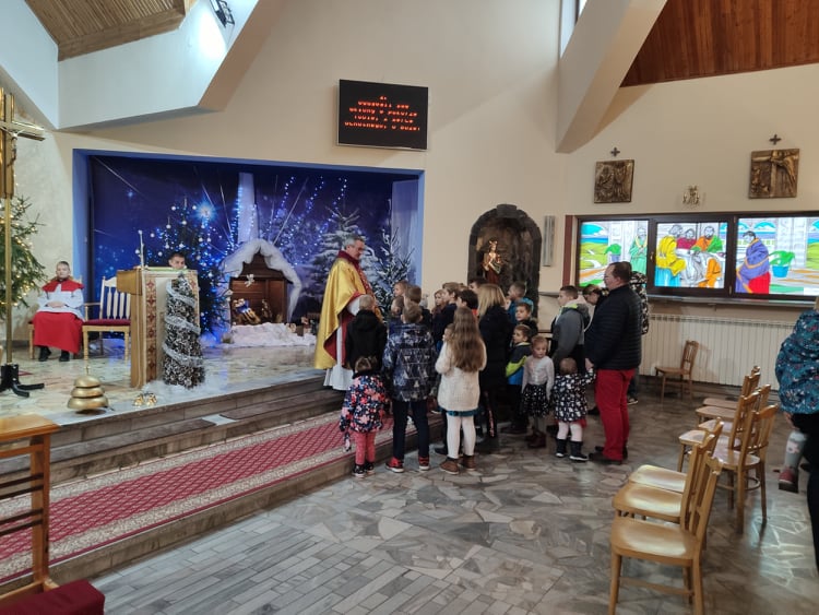 Tradycyjnie ksiądz proboszcz pod koniec Mszy zaprasza dzieci na wspólne kolędowanie. Na pociechy czekają także łakocie.